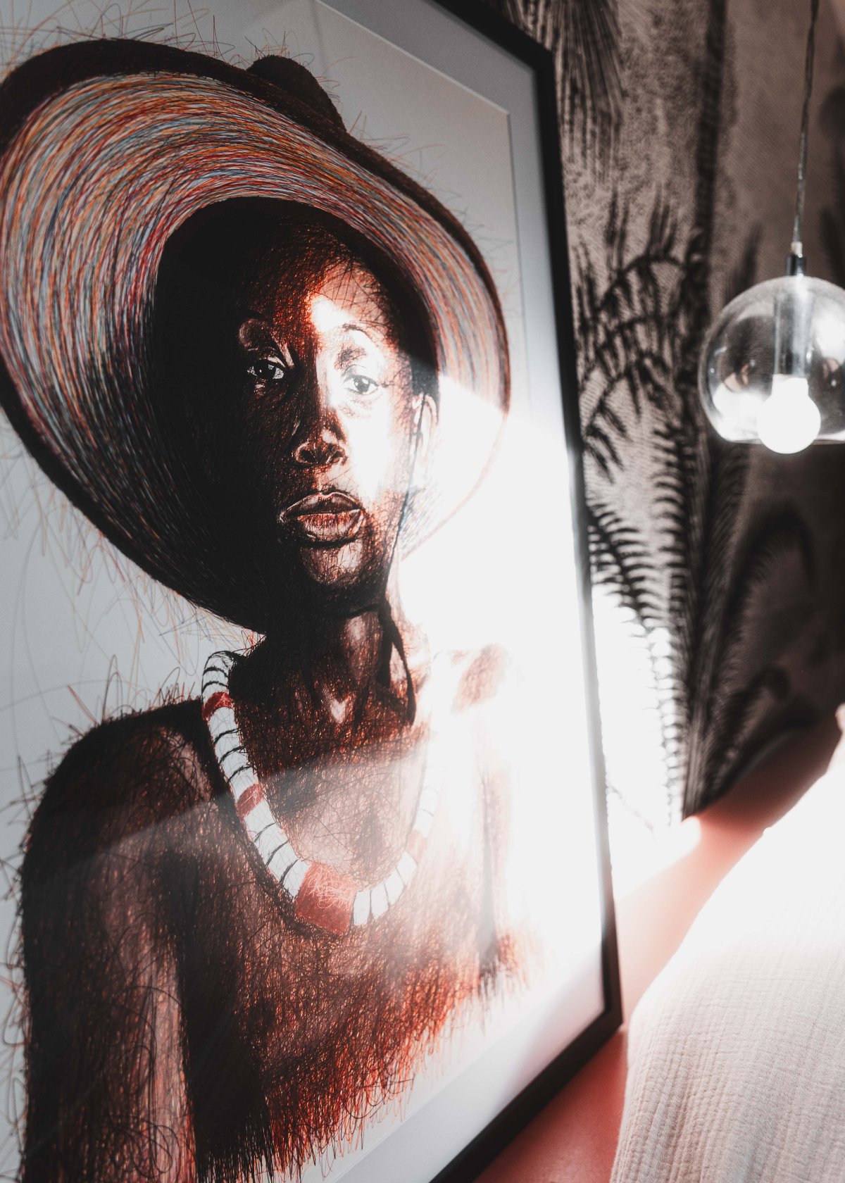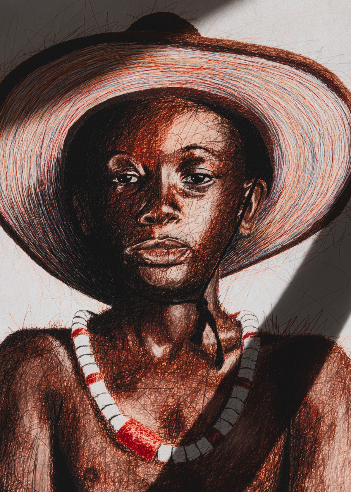 Le regard, direct et apaisé, ancre la composition. Il contraste avec l’énergie qui traverse le reste de l’image, notamment dans les contours et le chapeau, où les lignes s’accumulent, se croisent et vibrent.
